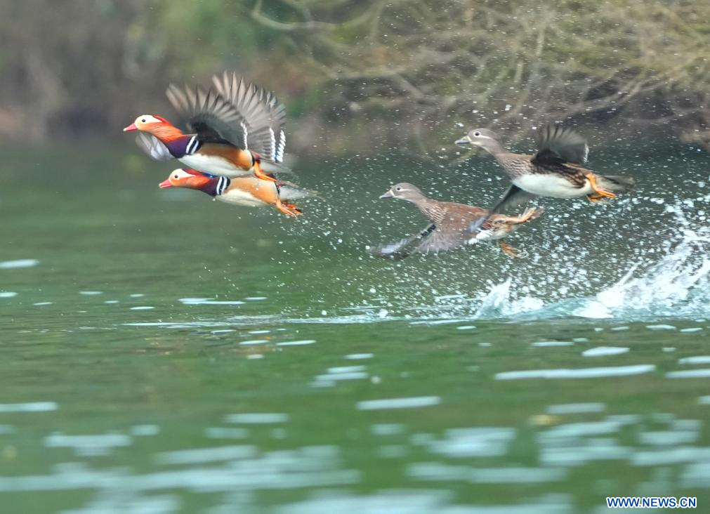 BEIJING, 8 février (Xinhua) -- Des canards mandarins s'amusent dans une rivière dans la ville de Hengyang de la province du Hunan, dans le centre de la Chine, le 4 février 2026. (Photo : Cao Zhengping)