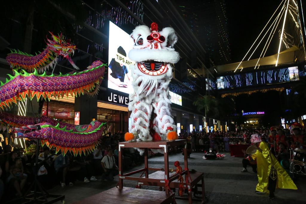 YANGON, 10 février (Xinhua) -- Des interprètes de la danse du lion se produisent lors d'une célébration du Nouvel An chinois à venir, à Yangon, au Myanmar, le 9 février 2026. (Xinhua/Myo Kyaw Soe)
