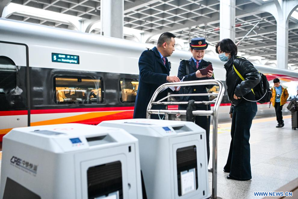 CHONGQING, 11 février (Xinhua) -- Les membres du personnel s'occupent des formalités de transport des animaux de compagnie sur un quai de la gare ferroviaire de Chongqing Ouest, dans la municipalité de Chongqing, dans le sud-ouest de la Chine, le 9 février 2026. Les autorités ferroviaires de Chongqing ont lancé un service pilote de transport d'animaux de compagnie sur les trains à grande vitesse sur certaines lignes durant la période du pic des voyages de la fête du Printemps.