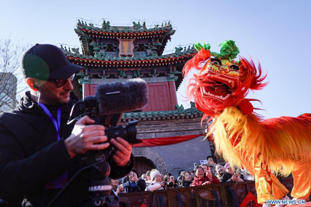 BEIJING, 18 février (Xinhua) -- Un étranger filme un spectacle de danse du lion lors d'une foire du temple à Beijing, capitale de la Chine, le 17 février 2026.