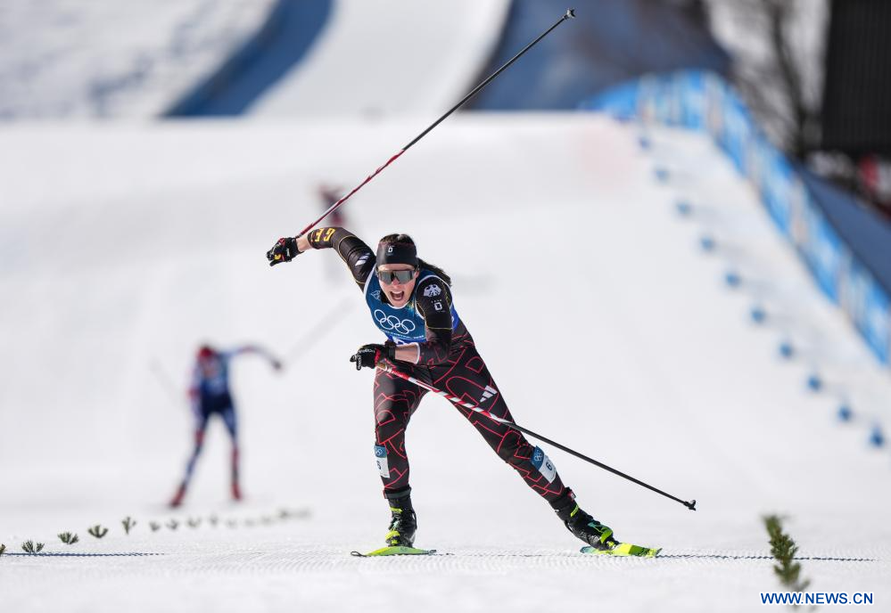 TESERO (Italie), 18 février (Xinhua) -- L'Allemande Coletta Rydzek franchit la ligne d'arrivée lors de la finale du ski de fond sprint libre par équipes femmes aux Jeux olympiques d'hiver de Milan Cortina 2026, à Tesero, en Italie, le 18 février 2026. (Xinhua/Peng Ziyang)