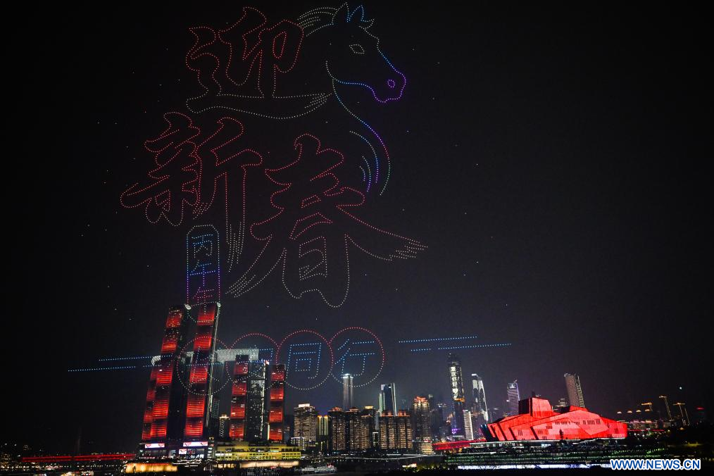 CHONGQING, 19 février (Xinhua) -- Un spectacle de lumières par drone ayant pour thème "Paysage majestueux, Chongqing dynamique" est présenté dans la municipalité de Chongqing, dans le sud-ouest de la Chine, le 17 février 2026. (Photo : Wang Quanchao)