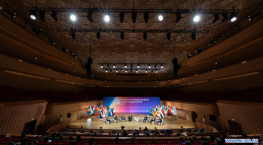 PARIS, 11 mars (Xinhua) -- Photo prise le 10 mars 2026 montrant une table ronde lors du deuxième Sommet sur l'énergie nucléaire à Paris, en France. (Xinhua/Wu Huiwo)