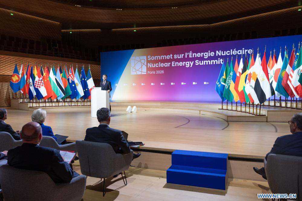 PARIS, 11 mars (Xinhua) -- Le président français Emmanuel Macron prononce un discours lors du deuxième Sommet sur l'énergie nucléaire à Paris, en France, le 10 mars 2026. (Ministère français de l'Europe et des Affaires étrangères/Handout via Xinhua)