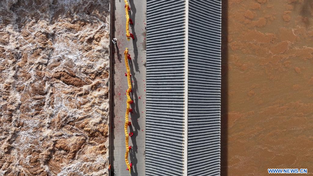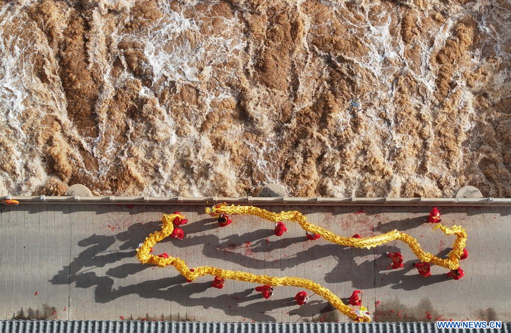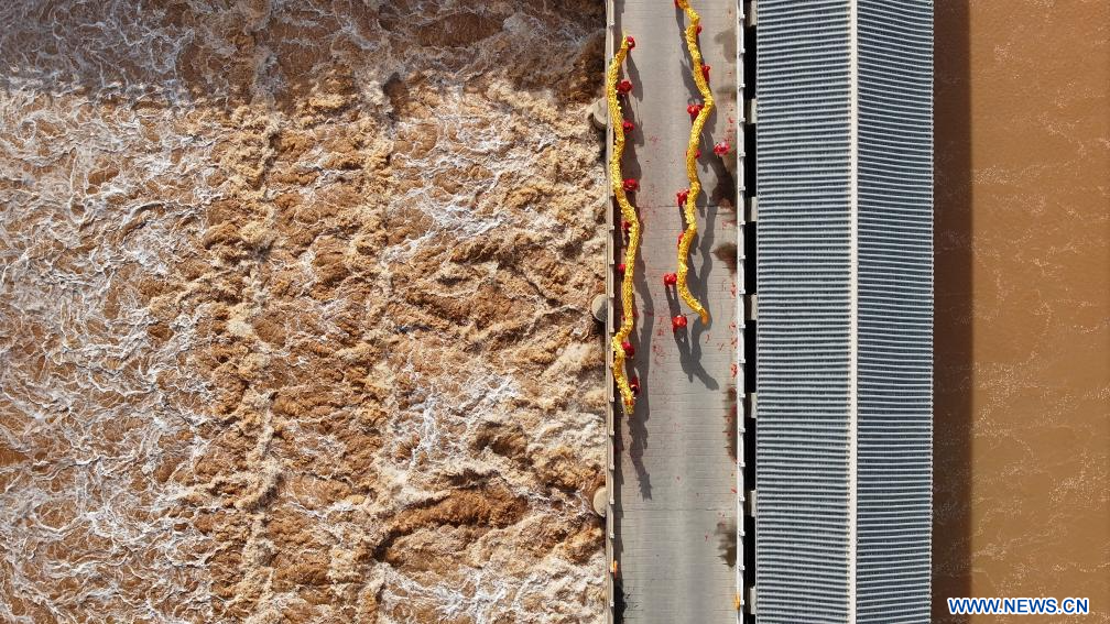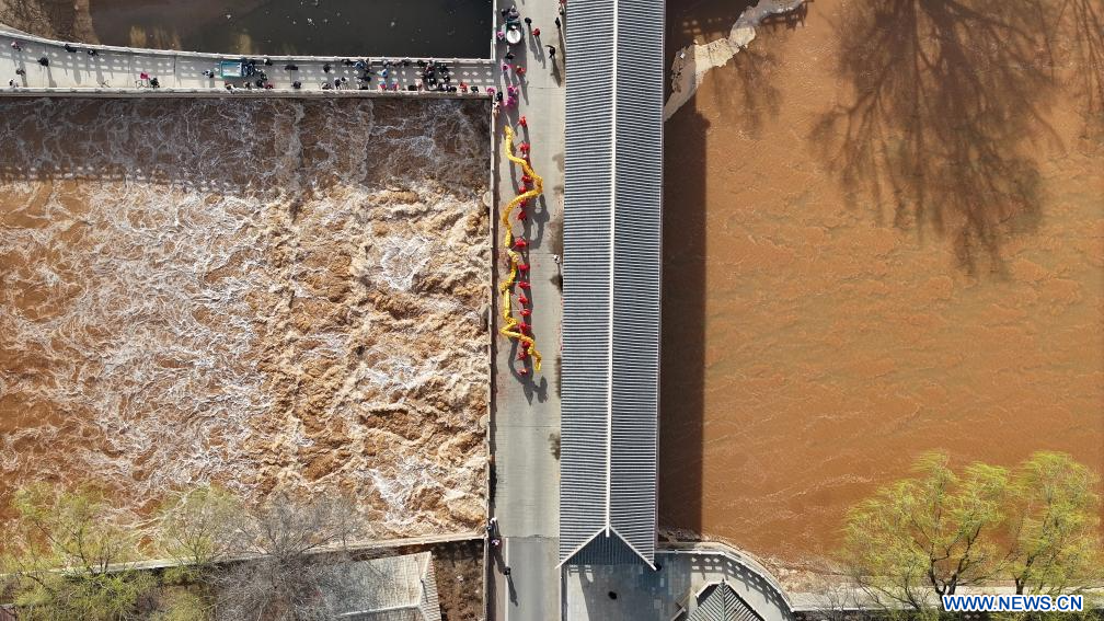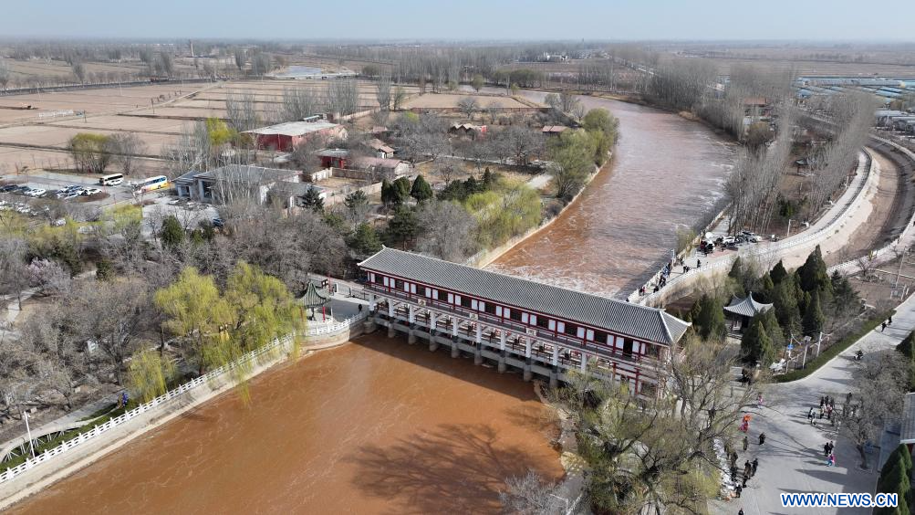 QINGTONGXIA, Ningxia, 25 mars (Xinhua) -- Vue aérienne d'une écluse ouverte déviant de l'eau du fleuve Jaune pour l'irrigation à Qingtongxia, dans la région autonome Hui du Ningxia, dans le nord-ouest de la Chine, le 24 mars 2026. (Photo : Wang Peng)
