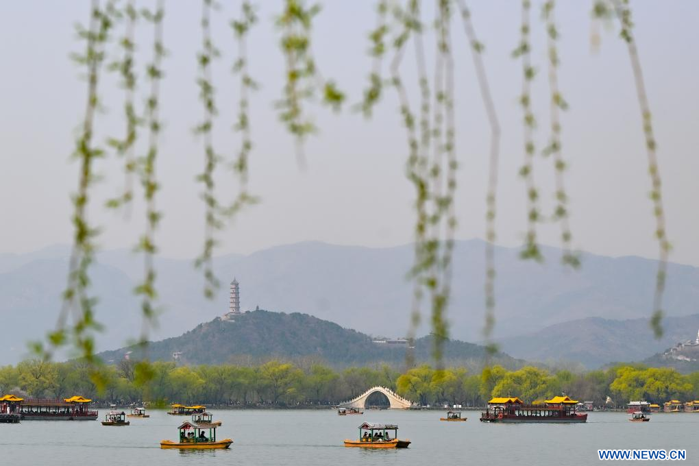 BEIJING, 29 mars (Xinhua) -- Des touristes prennent le bateau pour visiter le Palais d'été à Beijing, capitale chinoise, le 28 mars 2026. (Photo : Xin Yuewei)