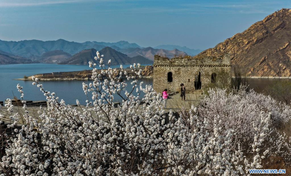 BEIJING, 4 avril (Xinhua) -- Photo prise par drone le 2 avril 2026 montrant des touristes visitant la section Xifengkou de la Grande Muraille dans le district de Qianxi, à Tangshan, dans la province chinoise du Hebei (nord). (Photo : Liu Mancang)