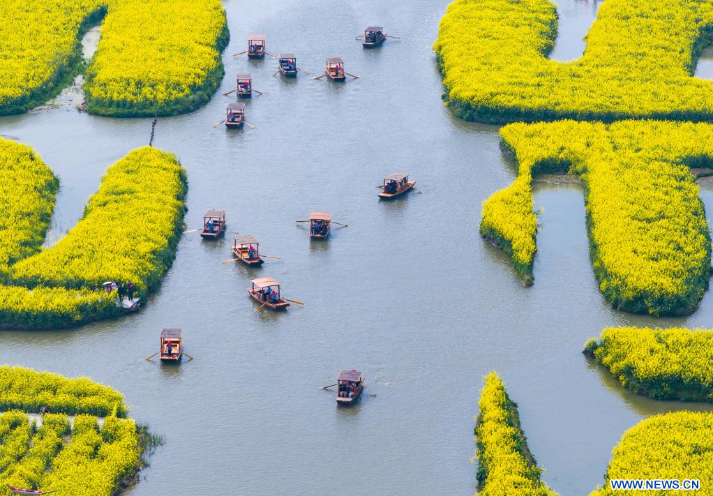 BEIJING, 4 avril (Xinhua) -- Photo prise par drone le 2 avril 2026 montrant des touristes prenant des bateaux dans une zone pittoresque de la ville de Xinghua, dans la province chinoise du Jiangsu (est). (Photo : Yang Suping)