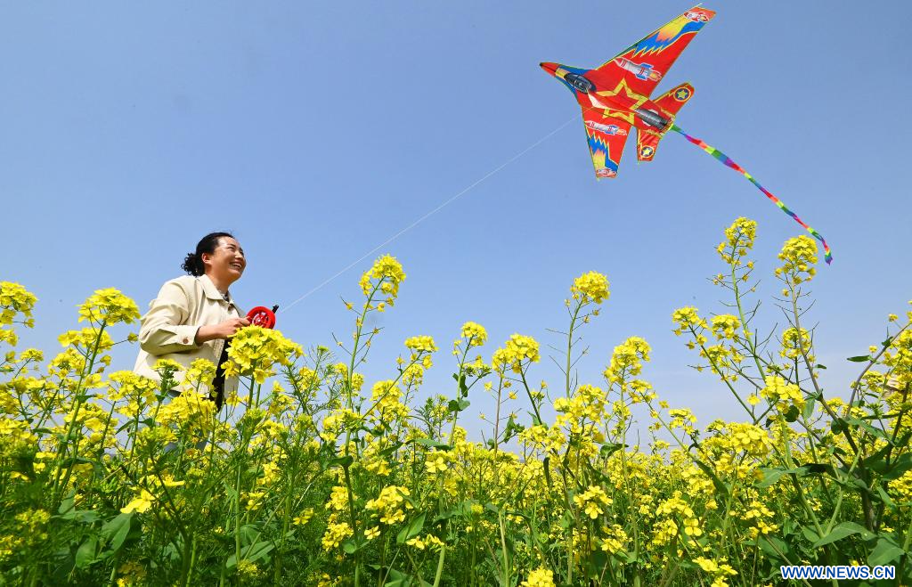 BEIJING, 4 avril (Xinhua) -- Une touriste fait voler un cerf-volant dans un champs de fleurs de colza à Handan, dans la province chinoise du Hebei (nord), le 3 avril 2026. (Photo : Hao Qunying)