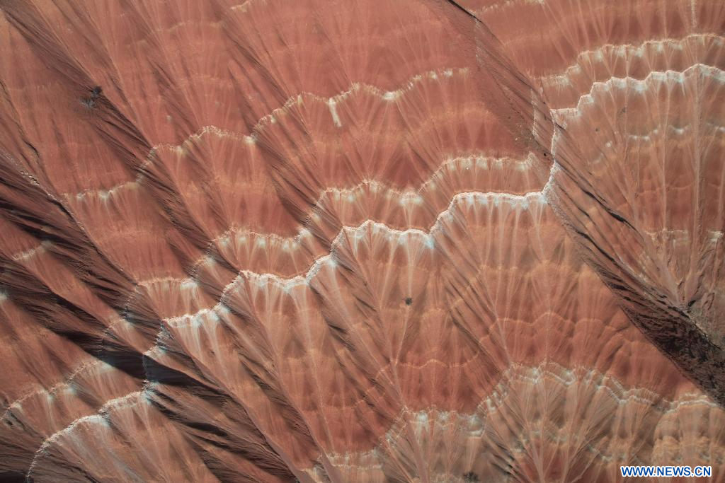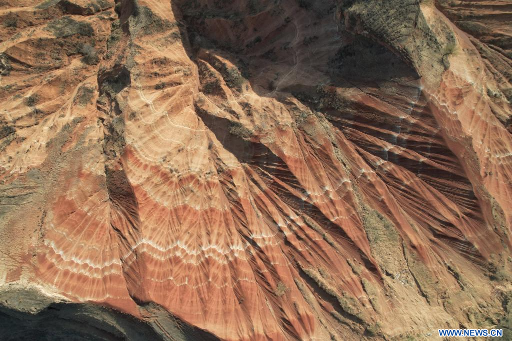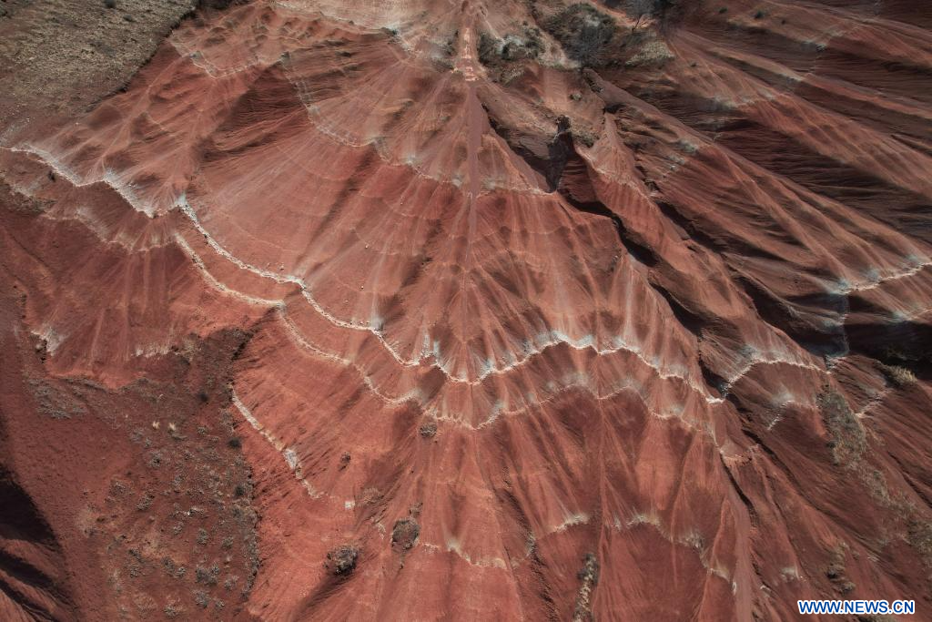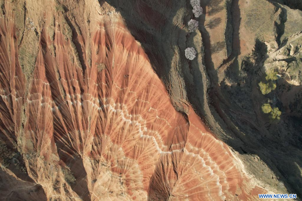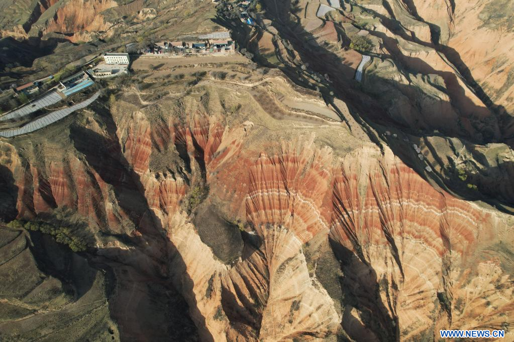 DONGXIANG, 5 avril (Xinhua) -- Photo aérienne prise par un drone montrant une vue des reliefs Danxia dans le bourg de Dongyuan du district autonome de Dongxiang, relevant de la préfecture autonome Hui de Linxia, dans la province chinoise du Gansu (nord-ouest), le 3 avril 2026. (Photo : Zhang Zhimin)