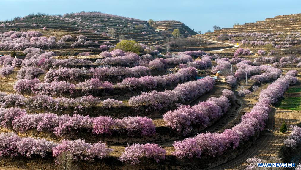 GUYUAN, 6 avril (Xinhua) -- Vue aérienne du paysage printanier du parc des rizières en terrasse de Jinjiping, dans le district de Pengyang à Guyuan, ville de la région autonome Hui du Ningxia, dans le nord-ouest de la Chine, le 5 avril 2026.