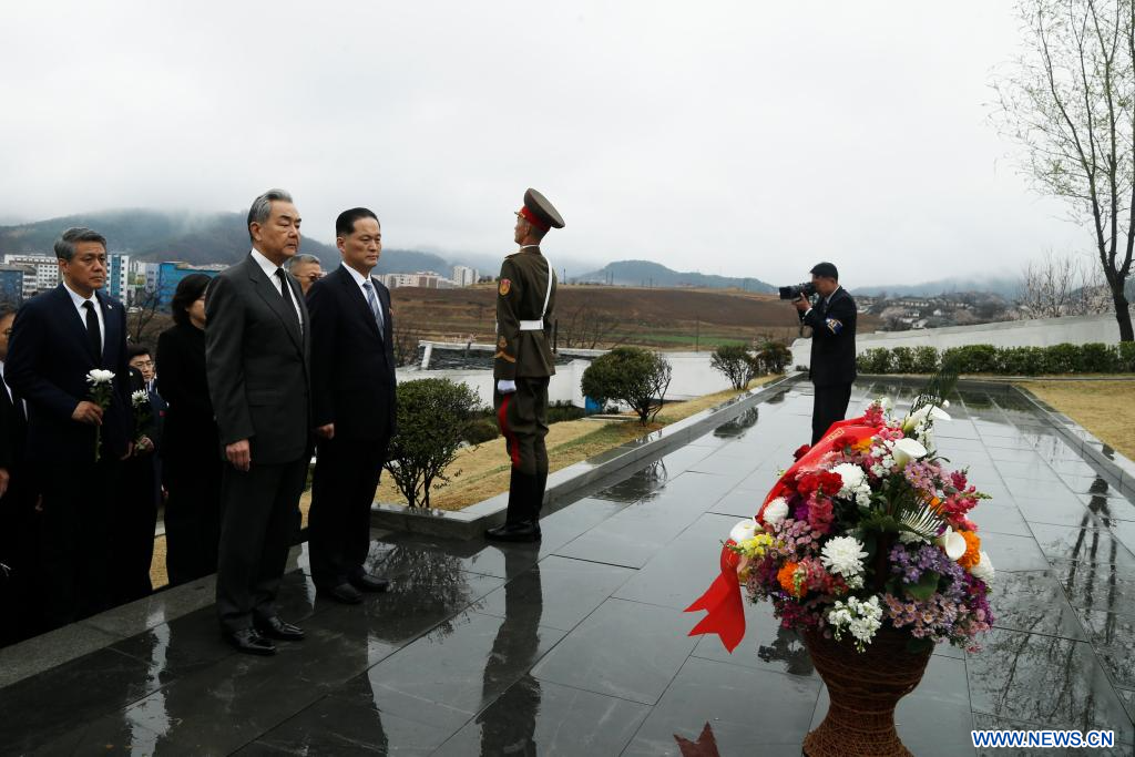 PYONGYANG, 10 avril (Xinhua) -- Le ministre chinois des Affaires étrangères, Wang Yi, s'est rendu vendredi au cimetière des martyrs des Volontaires du peuple chinois (VPC), situé dans le comté de Kangdong, pour leur rendre hommage.