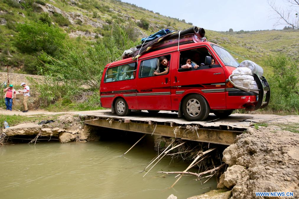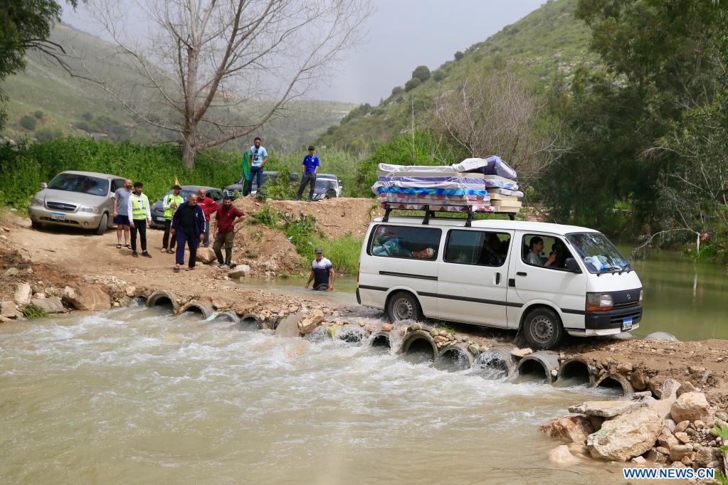 BEDIAS, 19 avril (Xinhua) -- Des personnes déplacées traversent un pont provisoire pour rentrer chez elles à Bedias, au Liban, le 18 avril 2026. Un cessez-le-feu de dix jours entre Israël et le Liban est entré en vigueur à minuit entre jeudi et vendredi, heure locale (21H00 GMT), suite à une annonce faite plus tôt par le président américain Donald Trump. (Xinhua/Ali Hashisho)