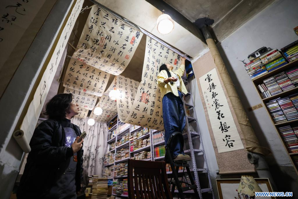 CHANGCHUN, 22 avril (Xinhua) -- Une libraire accroche des décorations dans la librairie Fanmo, à Changchun, dans la province chinoise du Jilin (nord-est), le 15 avril 2026.