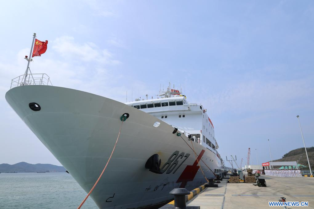 SANYA, 27 avril (Xinhua) -- Les membres d'équipage du navire-hôpital de la Marine de l'Armée populaire de libération (APL) de Chine, l'Arche de la Route de la Soie, se tiennent en formation alors que le navire accoste dans un port militaire à Sanya, dans la province de Hainan (sud de la Chine), le 26 avril 2026. (Photo : Cui Xiaoyang)