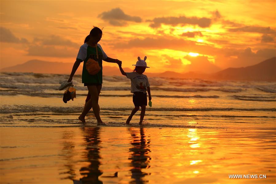 SANYA, 13 août (Xinhua) -- Des gens jouent sur la plage au coucher du soleil, à Sanya, dans la province chinoise de Hainan (sud), le 12 août 2018. (Photo : Chen Wenwu)