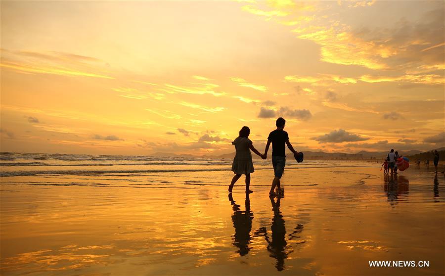 SANYA, 13 août (Xinhua) -- Des gens jouent sur la plage au coucher du soleil, à Sanya, dans la province chinoise de Hainan (sud), le 12 août 2018. (Photo : Chen Wenwu)