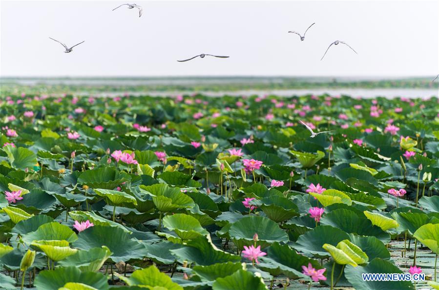 Photo prise le 15 août 2018 montrant le paysage du lac Honghu à Honghu, ville de la province du Hubei (centre de la Chine). (Xinhua/Xiong Qi)