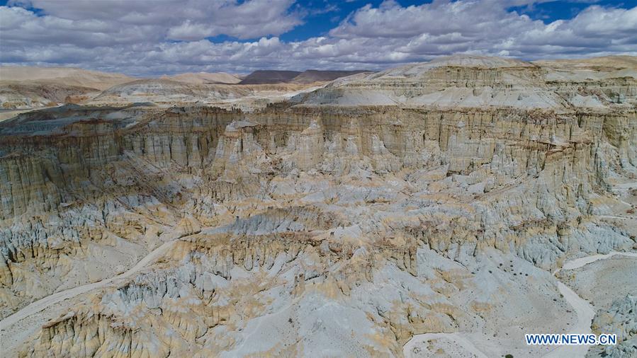 ALI, 16 septembre (Xinhua) -- Paysage de la forêt de terre de Xiayigou, dans le district de Zanda à Ali, dans la région autonome du Tibet (sud-ouest de la Chine), le 11 septembre 2018. Située le long de la rivière Xiangquan, la forêt de terre bien préservée apparaît colorée, en particulier sous la lumière directe du soleil, en raison du minerai qu'elle contient. (Photo : Purbu Zhaxi)
