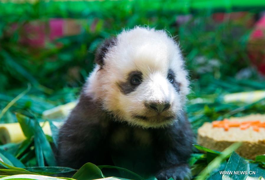Le bébé panda géant Long Zai dans le Chimelong Safari Park à Guangzhou, chef-lieu de la province du Guangdong (sud de la Chine), le 20 septembre 2018. Né ici le 12 juillet, le bébé pandas géant a fait jeudi sa première apparition publique. (Xinhua/Huang Guobao)