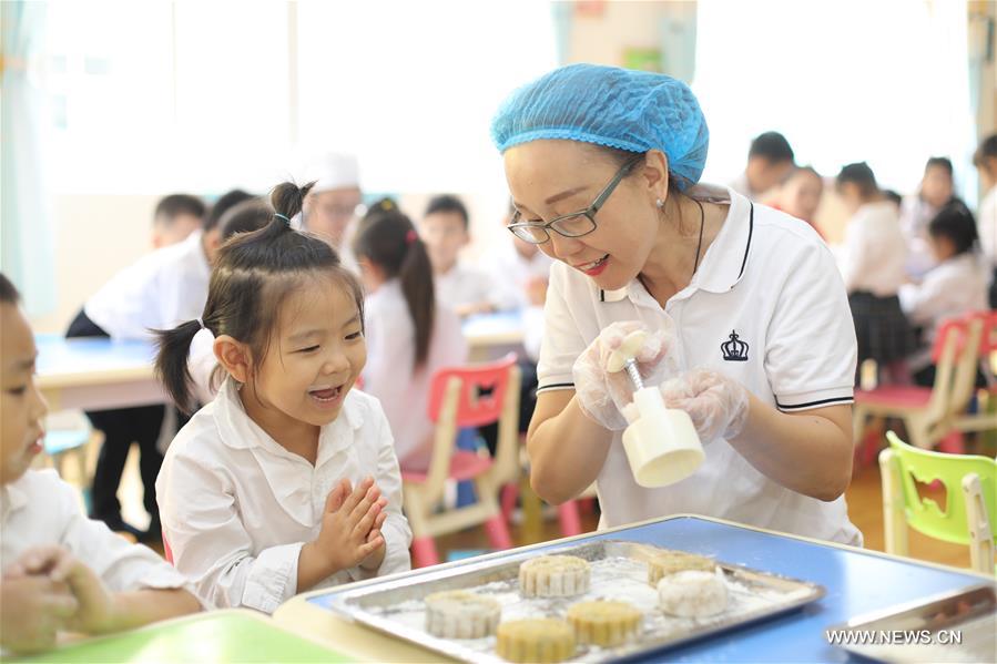 Des enfants apprennent à faire des gâteaux de lune dans une école maternelle pour accueillir la Fête de la mi-automne au district de Gucheng, dans la province du Hebei (nord de la Chine), le 21 septembre 2018. Cette année, la fête de la Lune tombe le 24 septembre. (Xinhua/Zhu Xudong)