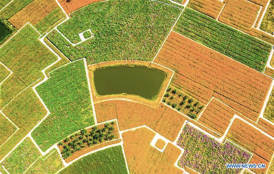 Photo aérienne prise le 25 septembre 2018 montrant des champs de fleurs au parc forestier de Santaishan à Suqian, ville de la province chinoise du Jiangsu (est). (Xinhua/Zhang Lianhua)