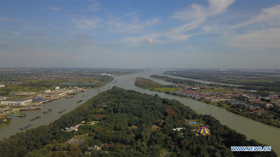 YANGZHOU, Jiangsu, 27 septembre (Xinhua) -- Photo aérienne du paysage automnal du parc de Zhuyuwan, à Yangzhou, dans la province chinoise du Jiangsu (est), le 26 septembre 2018. (Photo : Meng Delong)