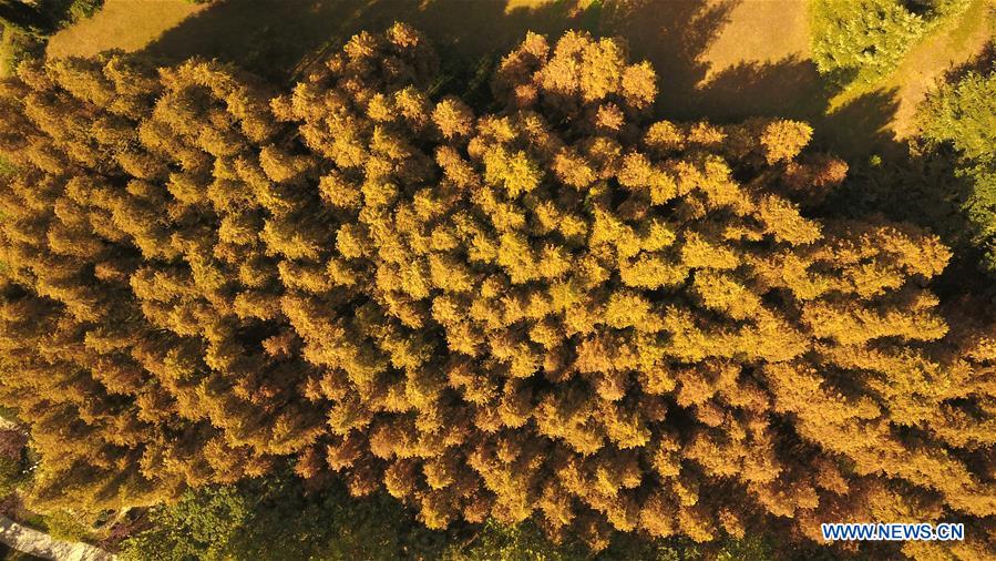 YANGZHOU, Jiangsu, 27 septembre (Xinhua) -- Photo aérienne du paysage automnal du parc de Zhuyuwan, à Yangzhou, dans la province chinoise du Jiangsu (est), le 26 septembre 2018. (Photo : Meng Delong)
