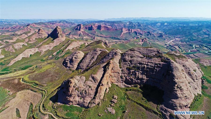 GUYUAN, Ningxia, 5 octobre (Xinhua) -- Photo aérienne du parc géologique national de Huoshizhai à Guyuan, dans la région autonome Hui du Ningxia (nord-ouest de la Chine), le 4 octobre 2018. (Photo : Wang Peng)