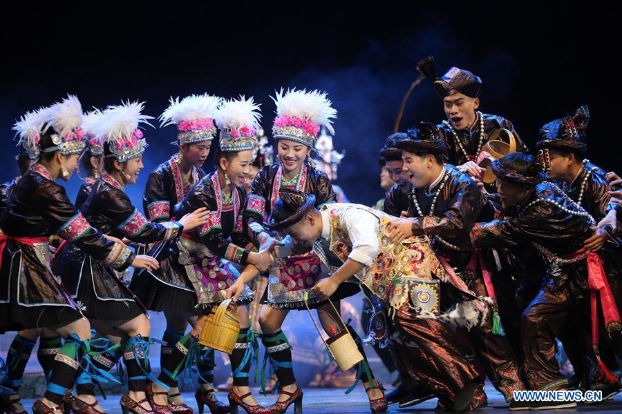 Une comédie musicale du groupe ethnique Dong est présentée à Guiyang, capitale de la province chinoise du Guizhou (sud-ouest de la Chine), le 10 octobre 2018. (Xinhua/Zhang Hui)