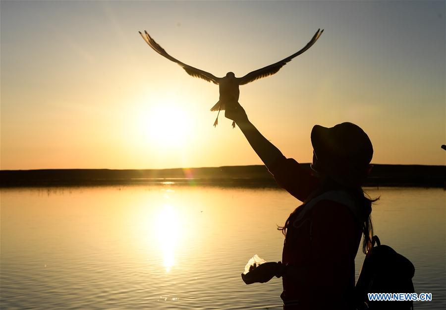 BANNIERE D'EJINA, 13 octobre (Xinhua) -- Une touriste nourrit un oiseau au bord du lac Juyan dans la bannière d'Ejina, dans la région autonome de Mongolie intérieure, dans le nord de la Chine, le 12 octobre 2018. (Photo : Ye Ziyan)