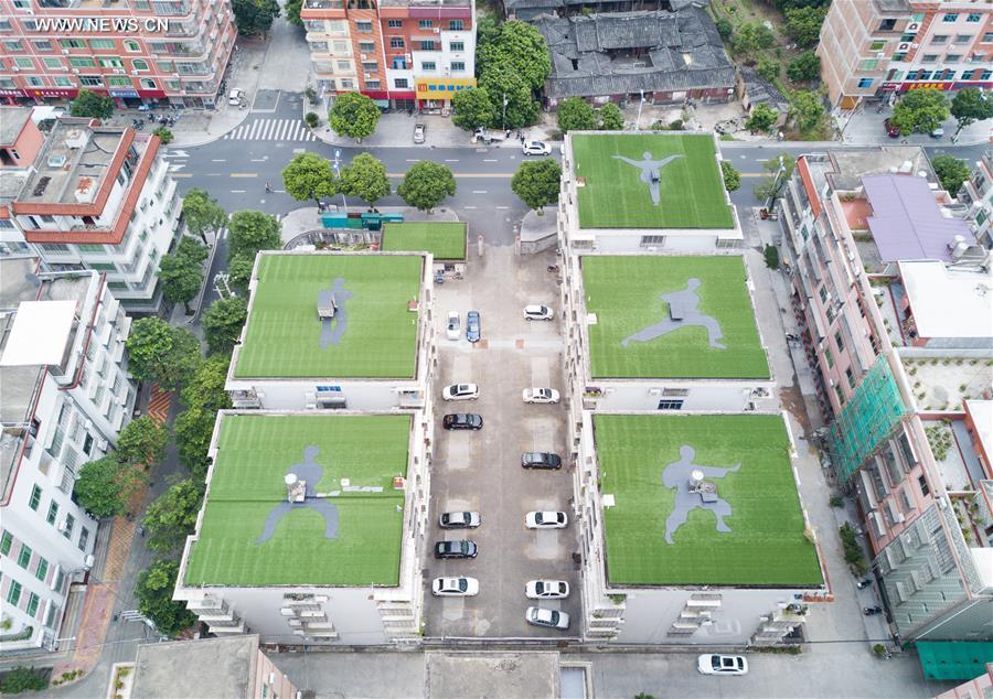 YONGCHUN, 25 octobre (Xinhua) -- Photo aérienne montrant des gazons en forme de postures de kung-fu sur des toits, à Yongchun, district de la province chinoise du Fujian (sud-est), le 24 octobre 2018. (Photo : Song Weiwei)