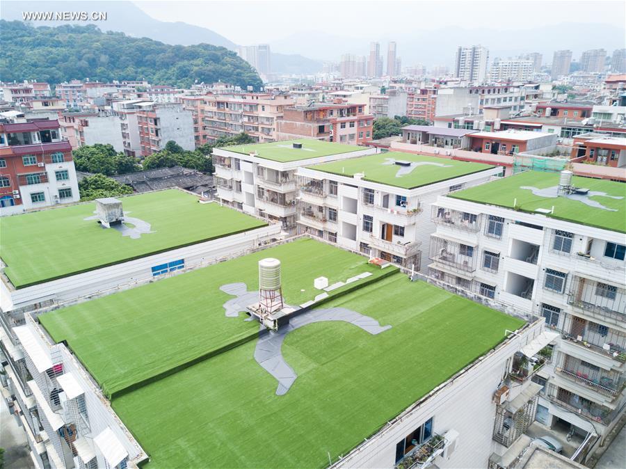 YONGCHUN, 25 octobre (Xinhua) -- Photo aérienne montrant des gazons en forme de postures de kung-fu sur des toits, à Yongchun, district de la province chinoise du Fujian (sud-est), le 24 octobre 2018. (Photo : Song Weiwei)