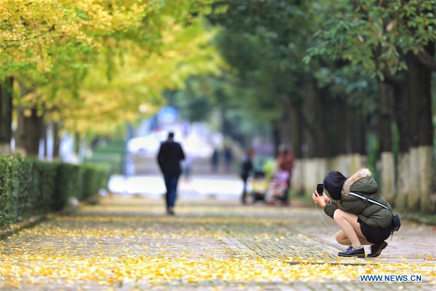 Une fille prend des photos des feuilles de ginkgo à Guiyang, dans la province chinoise du Guizhou (sud-ouest), le 25 octobre 2018. (Xinhua/Liu Xu)