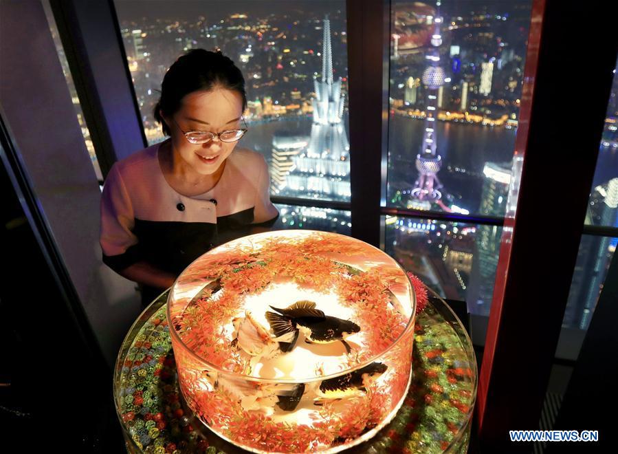 SHANGHAI, 26 octobre (Xinhua) -- La photo prise le 25 octobre 2018 montre une installation avec des poissons rouges dans un aquarium lumineux lors d'une exposition sur l'art de l'aquarium à l'Observatoire du Centre financier mondial de Shanghai. L'exposition présente près de 100 aquariums et 5.000 poissons rouges. (Photo : Liu Ying)