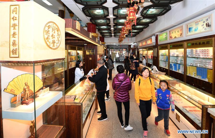 BEIJING, 30 octobre (Xinhua) -- Des clients dans une pharmacie de Tongrentang, une société pharmaceutique dotée d'une histoire de plus de 300 ans, à Beijing, capitale chinoise, le 25 octobre 2018. Créé en 1669, Tongrentang est aujourd'hui un important producteur et détaillant de médicaments traditionnels chinois en Chine et s'est bâti une réputation mondiale. Tongrentang est une marque déposée dans plus de 100 pays et régions. (Photo : Zhang Chenlin)