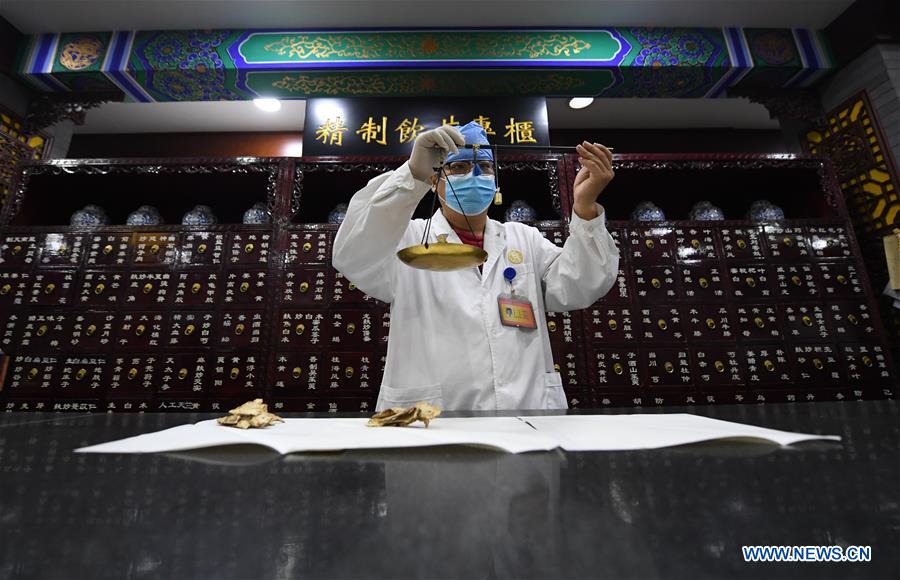 BEIJING, 30 octobre (Xinhua) -- Un pharmacien pèse des herbes dans une pharmacie de Tongrentang, une société pharmaceutique dotée d'une histoire de plus de 300 ans, à Beijing, capitale chinoise, le 25 octobre 2018. Créé en 1669, Tongrentang est aujourd'hui un important producteur et détaillant de médicaments traditionnels chinois en Chine et s'est bâti une réputation mondiale. Tongrentang est une marque déposée dans plus de 100 pays et régions. (Photo : Zhang Chenlin)