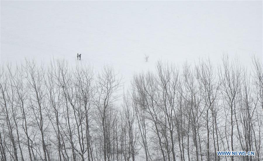 Des gens marchent dans la neige à Yantai, dans la province chinoise du Shandong (est), le 27 décembre 2018. (Xinhua/Tang Ke)