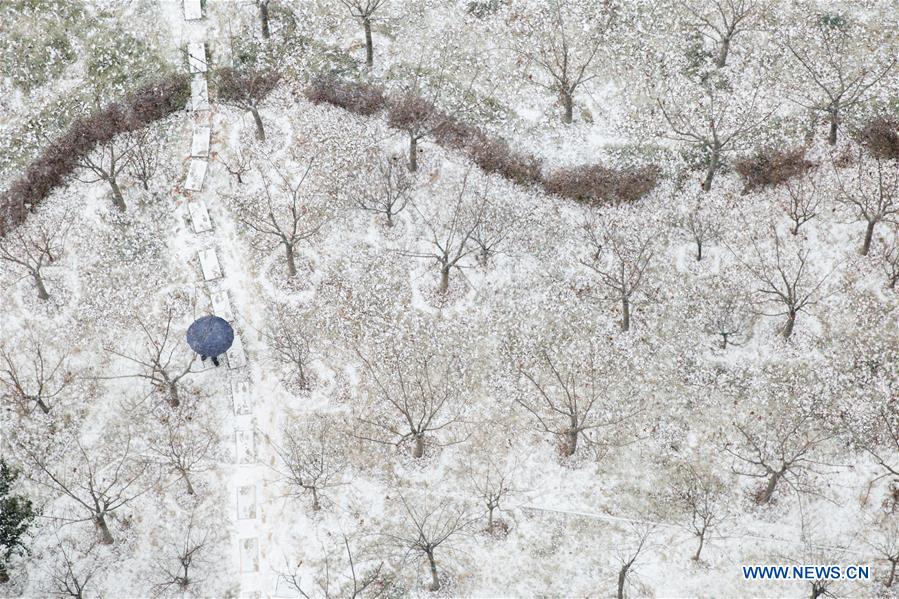 Un citoyen marche dans la neige à Handan, dans la province chinoise du Hebei (nord), le 27 décembre 2018. (Xinhua/Qiao Hailong)