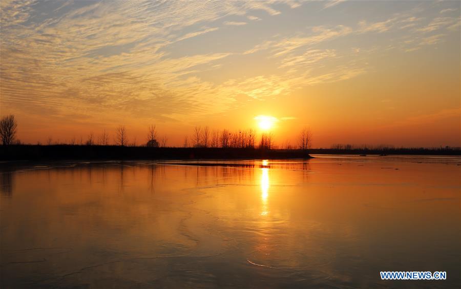Photo prise le 30 décembre 2018 montrant le paysage de la rivière Shuhe au coucher du soleil dans le district de Tancheng à Linyi, dans la province du Shandong (est de la Chine). (Xinhua/Zhang Chunlei)