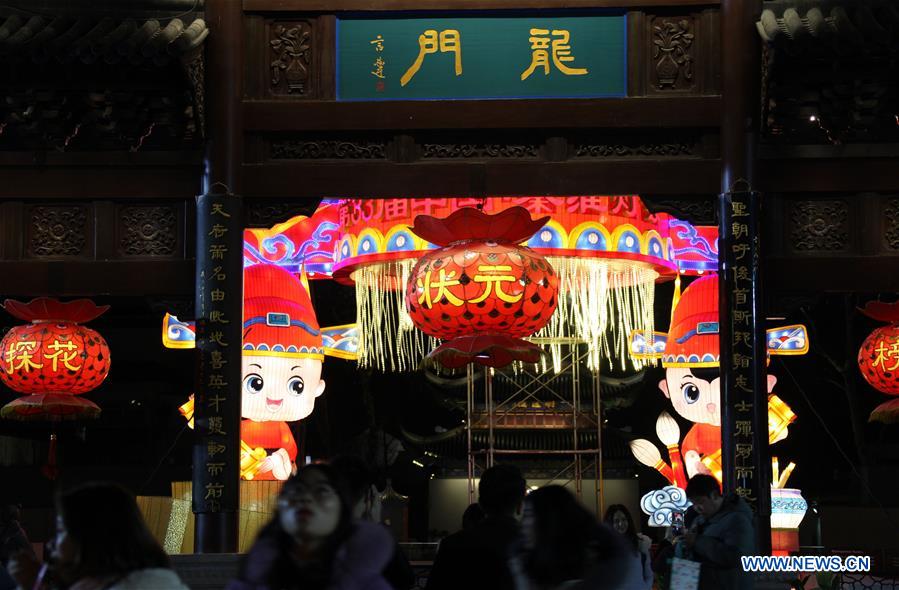 Des visiteurs regardent des lanternes dans la zone touristique du temple de Confucius à Nanjing, capitale de la province chinoise du Jiangsu (est), le 15 janvier 2019. La Foire de lanternes de Qinhuai sera ouverte officiellement au public du 28 janvier au 22 février. (Xinhua/Sun Zhongnan)