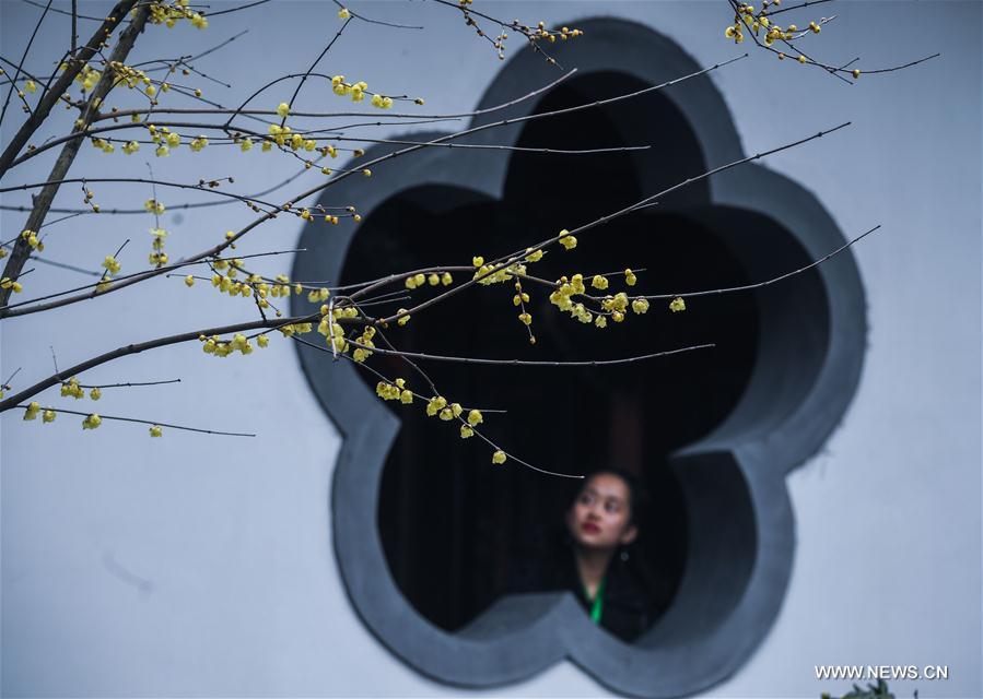 Photo prise le 16 janvier 2019 montrant des fleurs de prunier dans le site pittoresque de Chaoshan à Hangzhou, capitale de la province chinoise du Zhejiang (est). (Xinhua/Xu Yu)