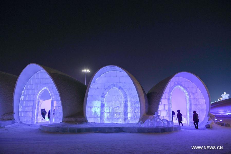 Des gens visitent un bar de glace dans le parc du "Monde de neige et de glace" à Harbin, capitale de la province chinoise du Heilongjiang (nord-est), le 17 janvier 2019. (Xinhua/Wang Song)