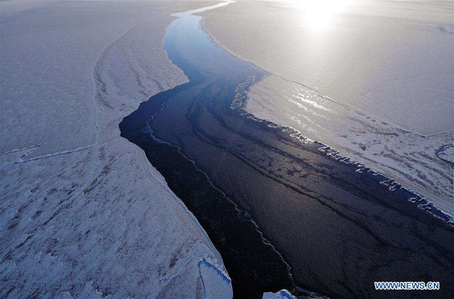 Photo aérienne prise le 16 janvier 2019 montrant le lac Qinghai gelé, dans la province du Qinghai (nord-ouest de la Chine). (Xinhua/Zhang Hongxiang)