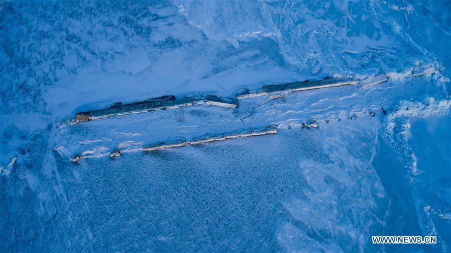 Photo aérienne prise le 16 janvier 2019 montrant le lac Qinghai gelé, dans la province du Qinghai (nord-ouest de la Chine). (Xinhua/Wu Gang)