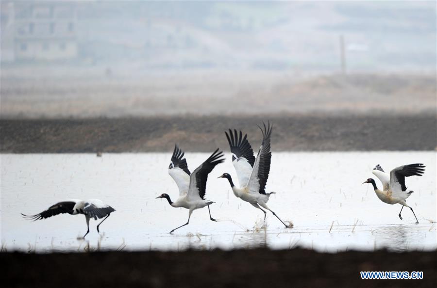 Photo prise le 18 janvier 2019 montrant des grues à cou noir dans la Réserve naturelle nationale de Caohai à Weining, dans la province du Guizhou (sud-ouest de la Chine). (Xinhua/Yang Wenbin)