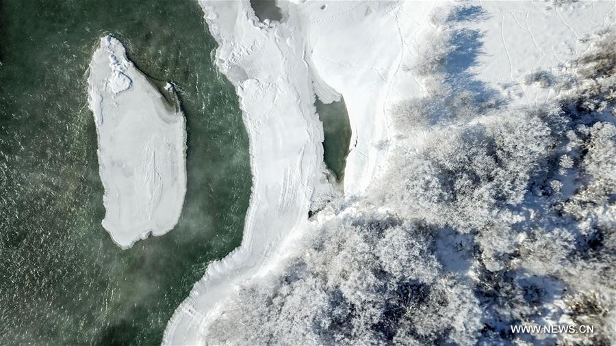 Photo aérienne prise le 19 janvier 2019 montrant le paysage du parc national de la zone humide du fleuve Tekes dans le district de Zhaosu, dans la région autonome ouïgoure du Xinjiang (nord-ouest). (Xinhua/Hu Huhu)