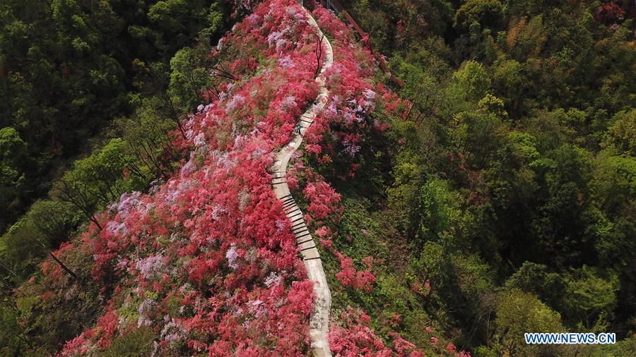 Des touristes admirent des azalées au site pittoresque de Tianxia, dans le district de Yuexi de la province chinoise de l'Anhui (est), le 12 avril 2019. (Xinhua/Zhang Duan)