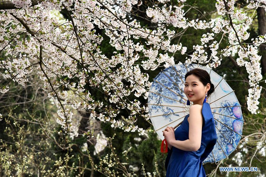 Une fille pose pour des photos avec des fleurs de cerisier dans le Parc Zhongshan à Qingdao, dans la province du Shandong (est de la Chine), le 13 avril 2019. (Xinhua/Li Ziheng)