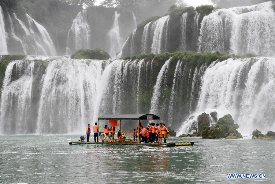Des touristes admirent les chutes d'eau de Detian sur un radeau en bambou dans le district de Daxin, dans la région autonome Zhuang du Guangxi (sud de la Chine), le 17 avril 2019. (Xinhua/Lu Boan)